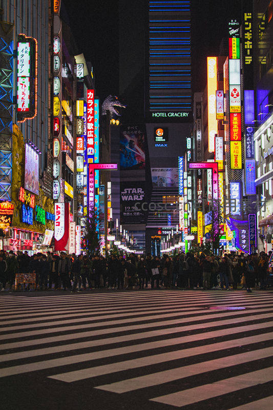 夜晚的东京街头被五彩斑斓的霓虹灯牌点亮,熙熙攘攘的人群在斑马线前等待,高楼林立间尽显亚洲大都市的活力与喧嚣。