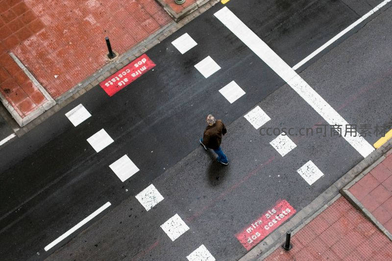 俯瞰视角下,一名行人独自走过湿漉漉的斑马线,红色地砖与黑色路面形成鲜明对比,营造出都市雨后的宁静与孤寂感。