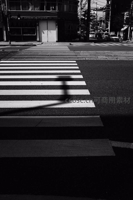 强烈的日光在黑白分明的斑马线上投下一个人的长影,背景是静谧的城市街角,充满极简主义的视觉张力。