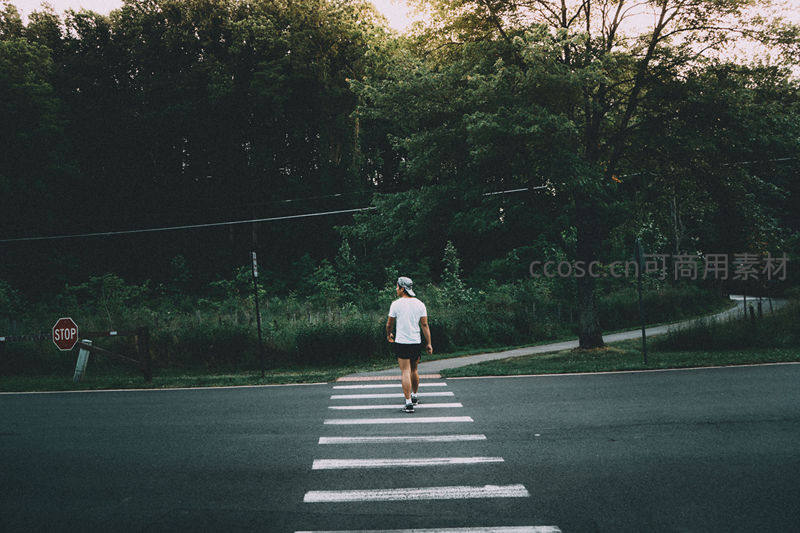 一名男子头戴帽子,背对镜头走在空旷的柏油路上,前方是通往幽深林间的斑马线,四周绿树成荫,画面宁静而富有诗意。
