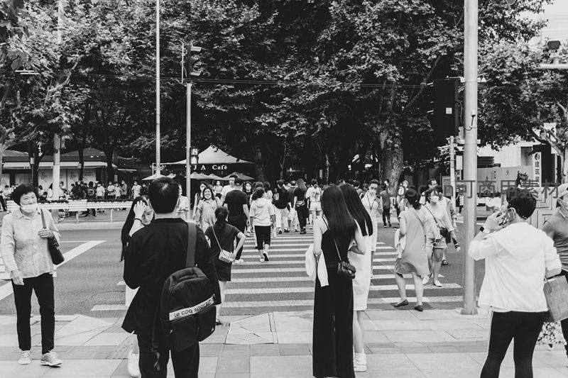 采用黑白滤镜捕捉城市街景,行人熙攘穿梭于绿树成荫的斑马线上,光影交错间传递出生活的节奏感与人文气息,极具纪实风格。