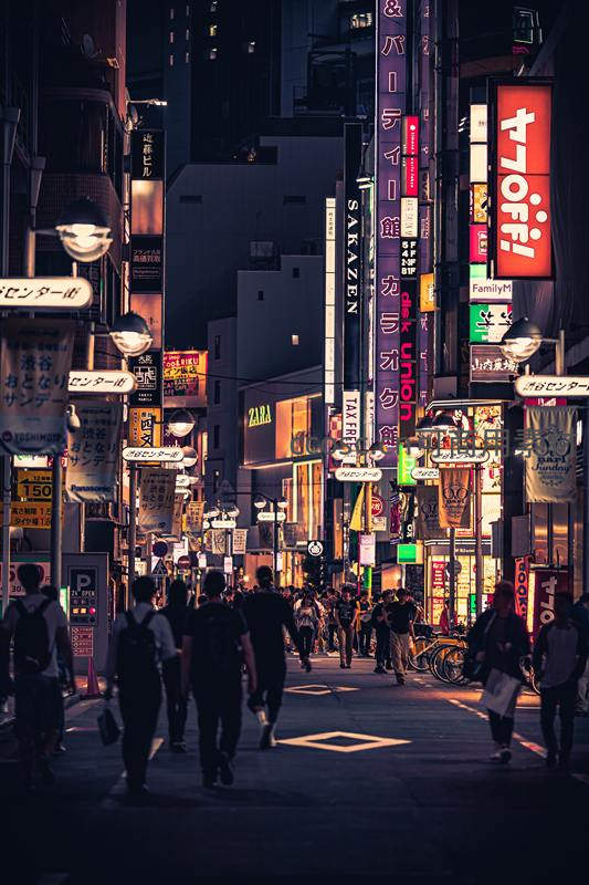 夜晚的商业步行街上人潮涌动,两侧高楼挂满色彩绚丽的日文霓虹广告牌,营造出充满活力与现代感的亚洲都市夜生活图景。