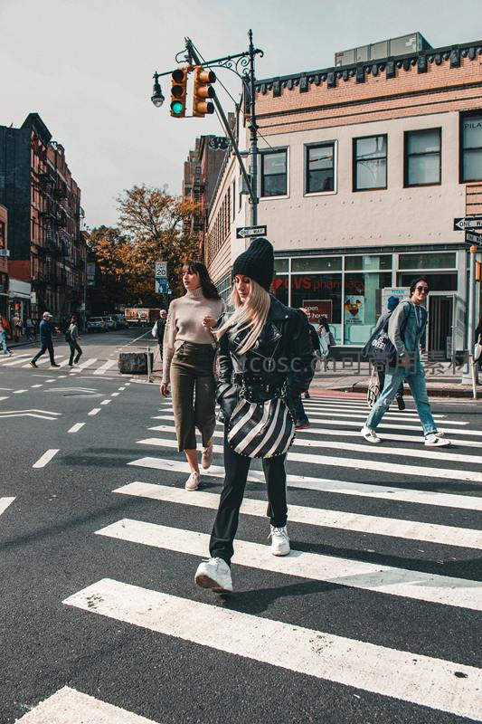 几位行人在纽约街头的斑马线上行走,背景是典型的砖墙建筑和绿树,阳光洒落,展现都市日常生活的悠闲与时尚感。