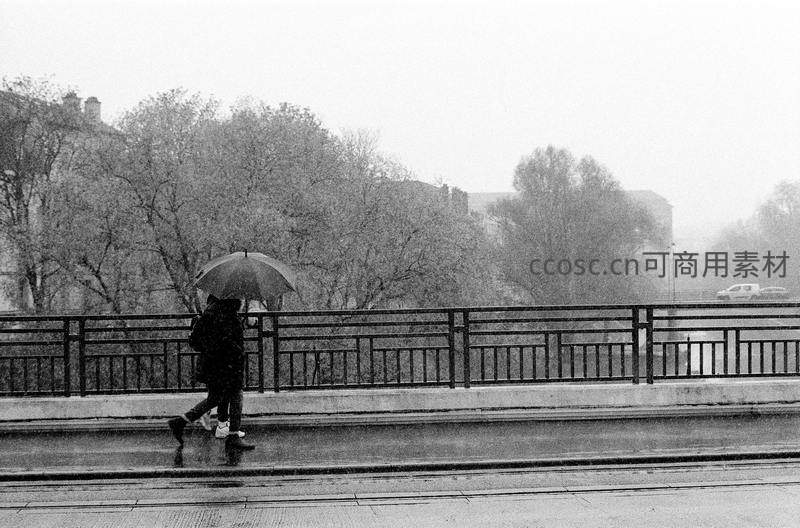 黑白影像中,一对情侣在雨中共享一把伞,缓缓走过城市桥梁,背景树木朦胧,画面充满诗意与静谧的浪漫氛围。