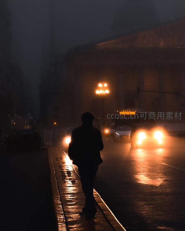 雨后湿漉的街道上,行人背对镜头缓步前行,远处车灯与路灯在浓雾中晕染出温暖光斑,古典建筑轮廓若隐若现,营造静谧而略带忧郁的都市夜色。
