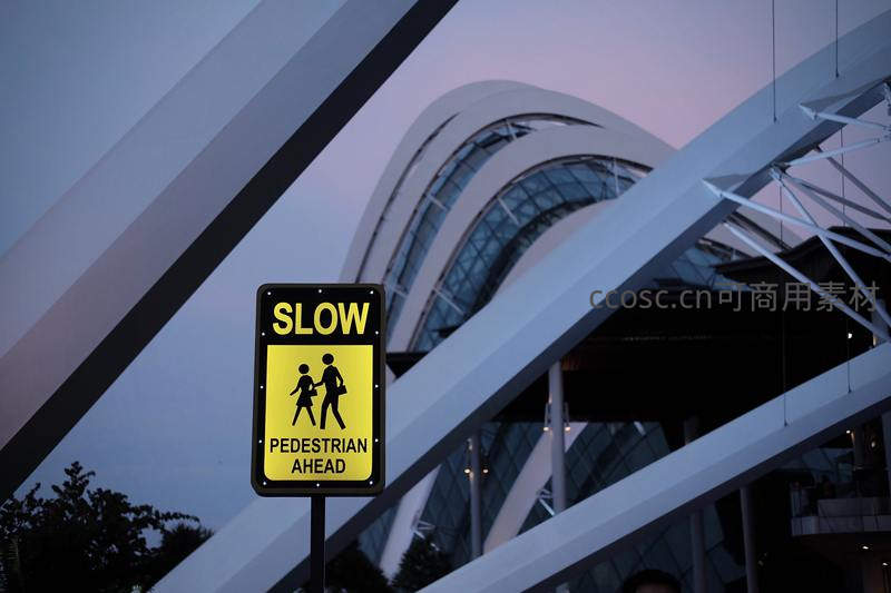 夕阳余晖下,醒目的黄色“SLOW”警示牌立于流线型现代建筑前,提醒车辆注意前方行人,几何线条与柔和天光交织成都市暮色图景。