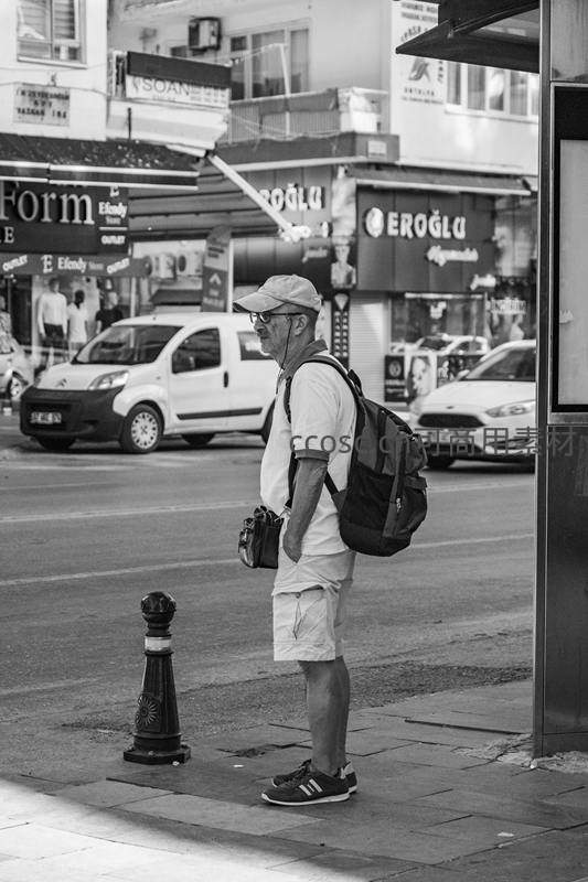 一位戴帽持相机的长者在街边公交站静静等待,身背双肩包,神情专注。黑白影像强化了时光沉淀感,背景车流与店铺勾勒出市井日常的真实图景。