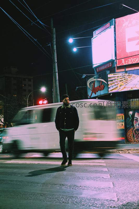 深夜街头,一名男子静立斑马线中央,身后是疾驰而过的白色面包车与绚烂广告牌。冷暖光交织,营造都市夜晚的疏离感与视觉张力,凸显个体在喧嚣中的沉静。