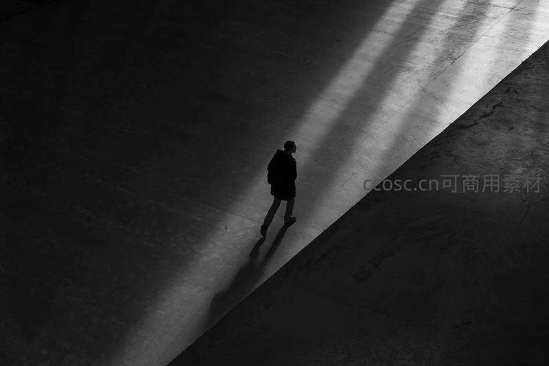 从高处俯拍,一人独自走在被斜射阳光分割的空旷地面上,强烈的明暗对比营造出戏剧性的视觉效果,传递出沉思与孤寂感。