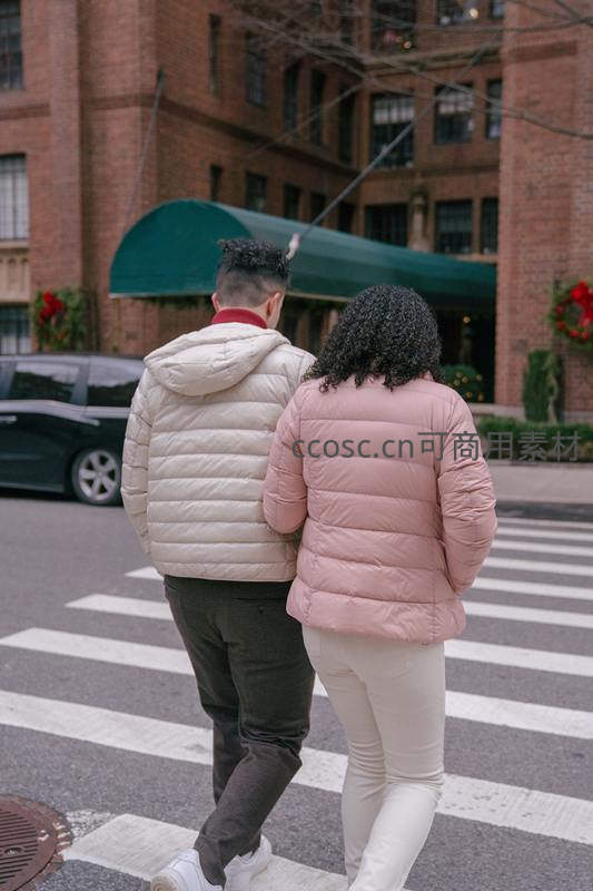 一对情侣穿着厚实羽绒服,在铺满节日装饰的砖墙建筑前携手过马路,画面充满冬日暖意与浪漫氛围。