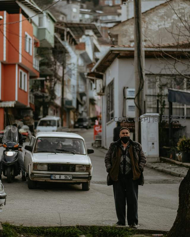一位戴口罩的中年男子站在色彩斑斓的老城街道中央,背景是老旧汽车和居民楼,呈现真实市井生活的瞬间。
