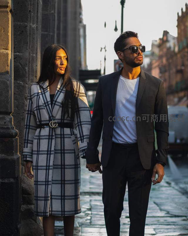 一对时尚情侣手牵手走在欧洲风格的古老石板路上,阳光温柔地洒在他们身上,背景是斑驳的砖墙和复古建筑,氛围温馨浪漫。