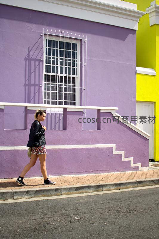 一位女士在色彩鲜艳的紫色与黄色建筑前走过,阳光洒落,砖石路面映衬着她的身影,充满活力的城市生活气息扑面而来。