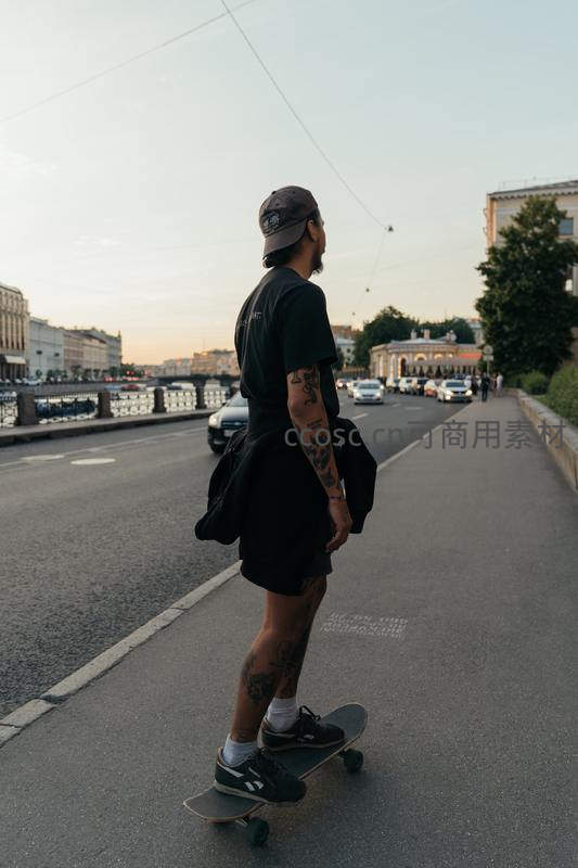 年轻滑手脚踩滑板,手臂纹身清晰可见,头戴棒球帽,在黄昏的城市街道上滑行,远处车流与桥梁勾勒出都市活力剪影。