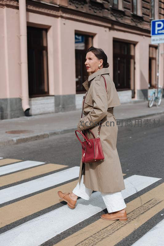 一位穿着卡其风衣、搭配红色手提包的女性正侧身走过斑马线,背景是粉色外墙的老式建筑,尽显都市女性的精致与从容。