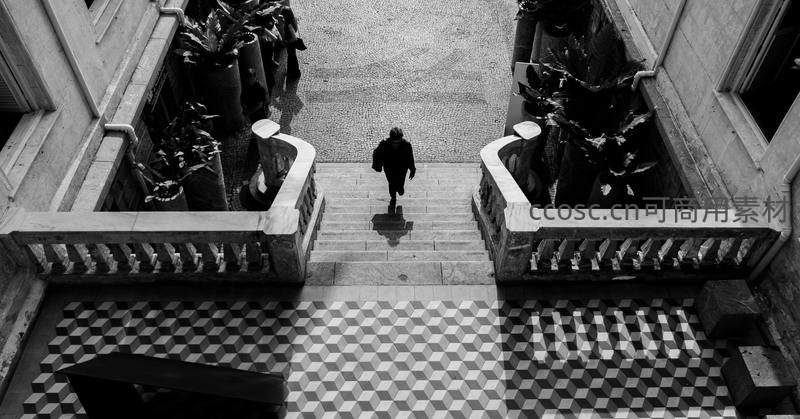 从高处俯瞰,一人独行于古典建筑的石阶之上,黑白影调强化了空间的纵深感与人物的孤寂氛围,构图极具艺术感。