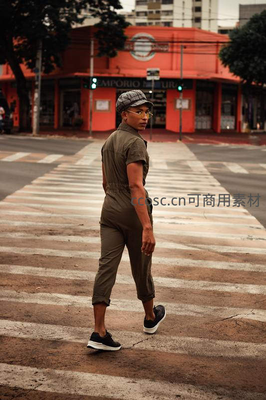 一位身穿军绿色连体裤、头戴格纹帽的青年站在斑马线上,回头凝视镜头,背景是橙红色店铺和绿树,定格了都市街头充满个性与故事感的一刻。