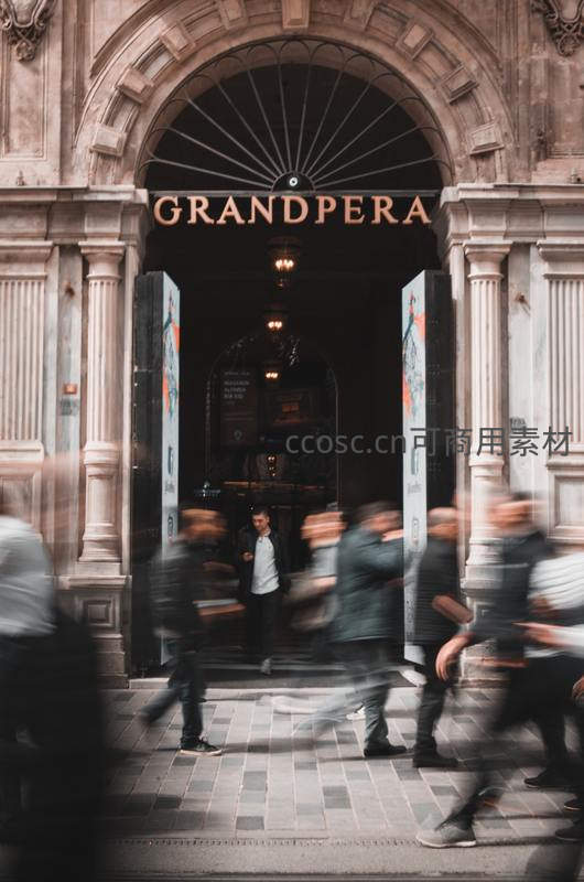 宏伟的古典歌剧院入口,金色“GRANDPERA”字样醒目,门前行人匆匆而过,留下动态模糊轨迹,展现都市生活的节奏与艺术殿堂的静谧对比。