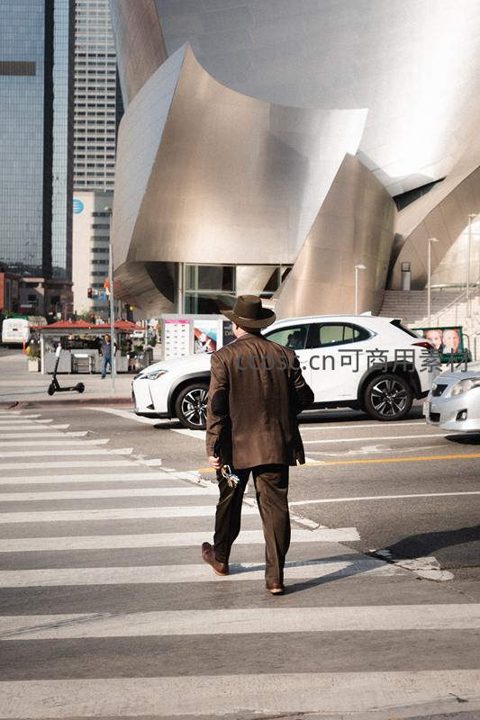 一位身着棕色西装、头戴礼帽的男士背对镜头,正走过斑马线。背景是极具未来感的金属曲面建筑和现代高楼,构成一幅充满故事感的城市街景。