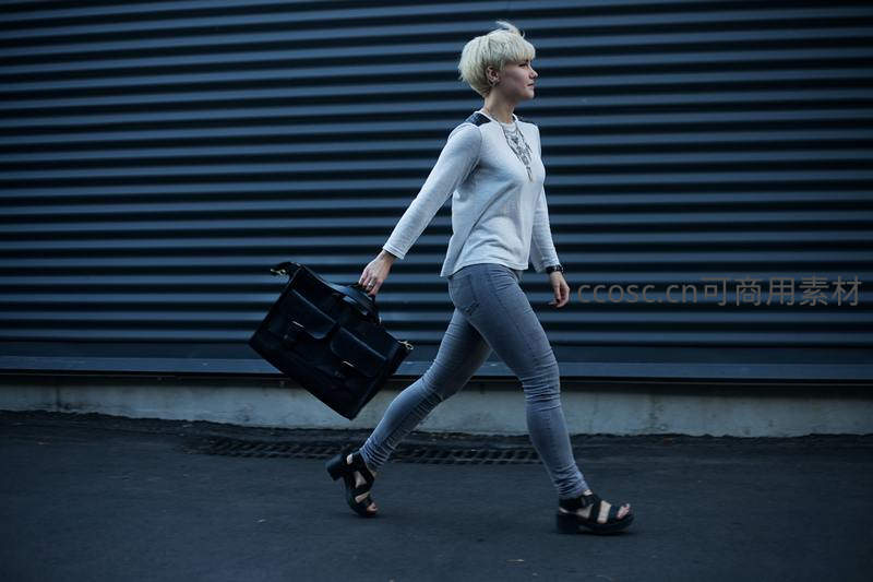 一位金发短发的年轻女性,身穿简约白色上衣与灰色牛仔裤,手提黑色公文包,步伐坚定地走在深色卷帘门前,展现出干练自信的都市职业女性形象。