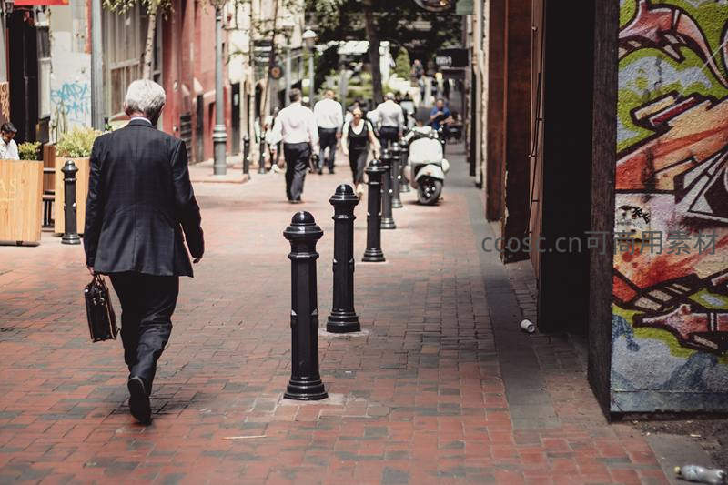 一位银发男士身着西装,手提公文包走在铺满红砖的小巷中,两侧是涂鸦墙与行人,营造出怀旧又充满生活气息的城市角落。