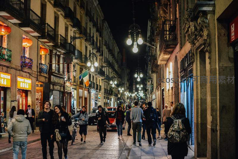 夜幕下的巴塞罗那老街,灯火阑珊人潮涌动