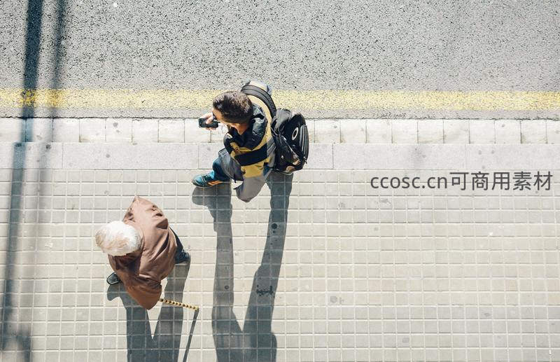 高角度俯拍祖孙二人街头漫步温馨时刻