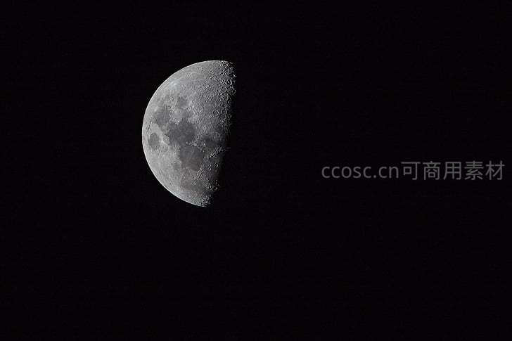 漆黑的宇宙背景下,月球的半面被阳光照亮,表面环形山与月海纹理清晰可见,展现出天体运行的庄严与宇宙的浩瀚无垠。