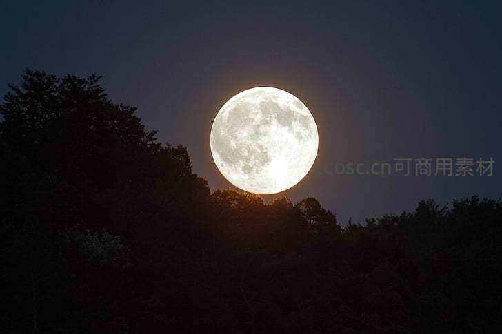 一轮明亮的满月从茂密森林的树冠后缓缓升起,柔和的月光洒在枝叶间,营造出梦幻般的自然夜景。