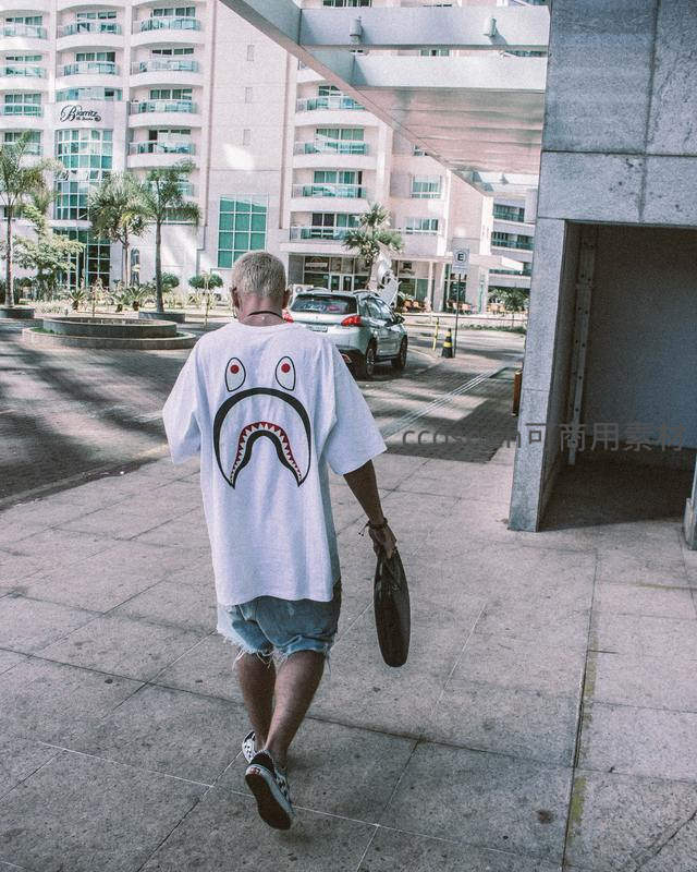 一位年轻男子背对镜头走在现代都市的步行道上,身穿印有夸张鲨鱼图案的白色T恤和破洞牛仔短裤,手持滑板,背景是度假酒店与热带绿植。