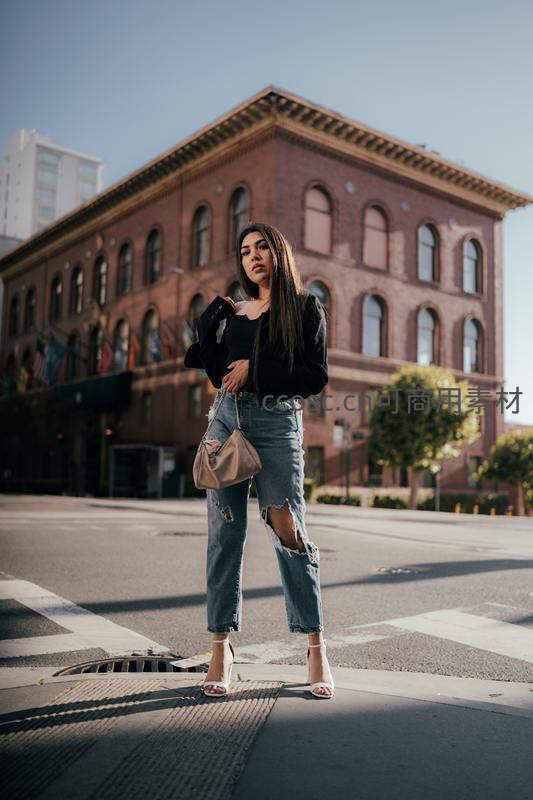 一位年轻女性身着黑色上衣与破洞牛仔裤,站在阳光明媚的城市街道上,背景是复古红砖建筑,展现都市时尚魅力。