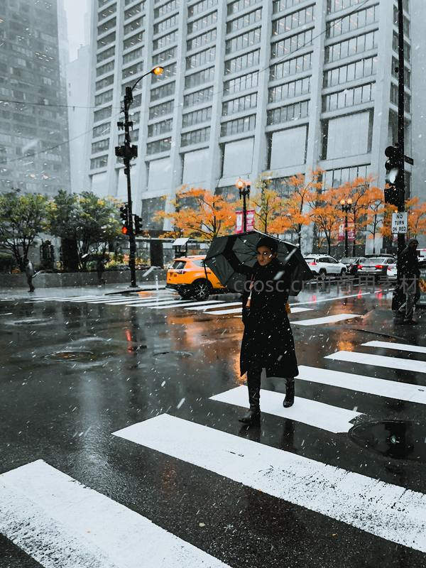 细雨飘洒的城市街头,一位行人撑黑伞走过湿漉漉的斑马线,背景是高耸楼宇与金黄秋叶,营造出诗意而略带忧郁的氛围。