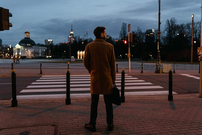 一名男子独自站在斑马线前,凝望远方渐亮的城市灯光与地标建筑,画面充满沉思与都市夜晚的宁静感。