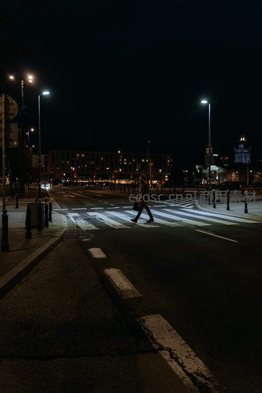 深夜孤影穿越马路,路灯勾勒寂寥身影