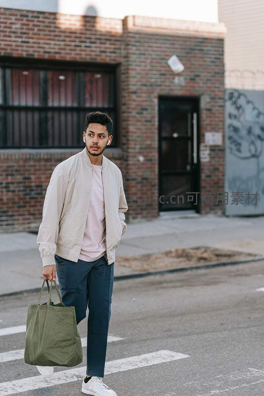 一位穿着米色夹克和粉色T恤的青年在砖墙背景的街道上行走,手提绿色布袋,展现出都市休闲与时尚结合的生活方式。