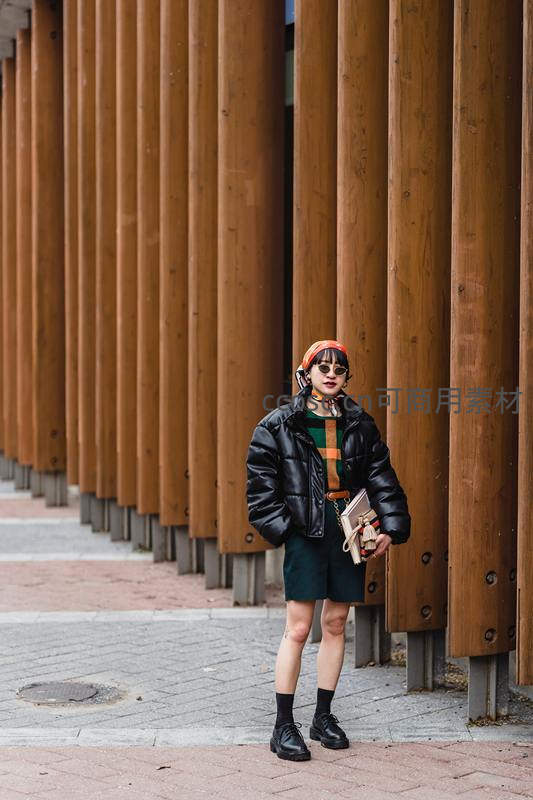 一位戴着橙色头巾和墨镜的女孩站在木质立柱前,身穿黑色羽绒服和格纹内搭,手持小包,展现充满个性的秋冬街头时尚风格。