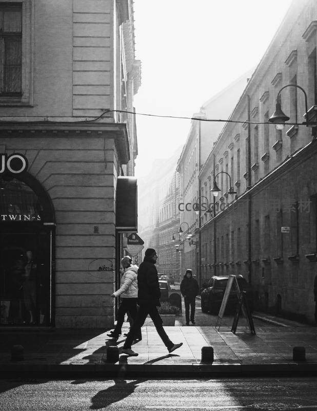 黑白影像捕捉了欧洲老城区的宁静街角,行人穿梭于古典建筑之间,阳光透过楼宇缝隙,在地面投下长长的影子,营造出浓厚的人文氛围。