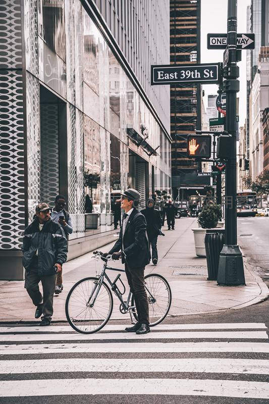 在纽约东39街的斑马线上,一名西装男子推着自行车等待通行,背景是现代玻璃幕墙建筑和清晰的路牌,展现都市通勤者的日常与城市节奏。