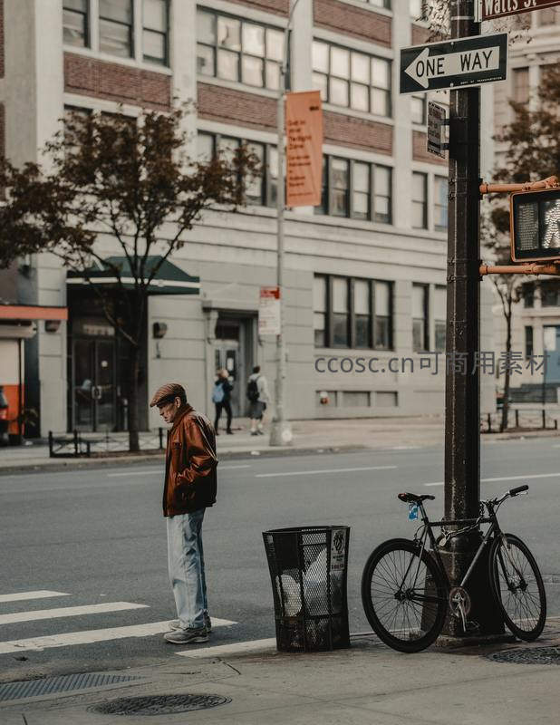 一位戴帽男子独自站在街角,身旁停放着一辆单车,背景是典型的城市建筑和单行道标志,画面安静而富有故事感,仿佛在等待某个未至的约定。