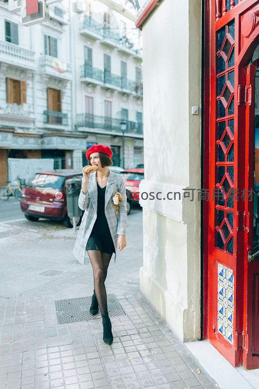 戴着红色贝雷帽的女子站在色彩鲜艳的门边,正享受手中的食物,背景是欧式阳台建筑,充满生活气息与法式浪漫情调。