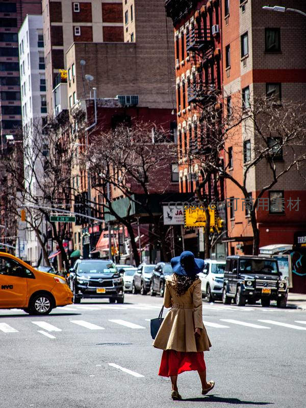 一位身着卡其风衣、头戴蓝色宽檐帽的女子背对镜头走在纽约街头,周围车流穿梭,展现了大都市中独特的个人风格与节奏。