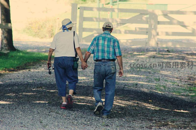 一对白发老人手牵着手,在铺满碎石的乡间小路上缓步前行,阳光透过树影洒落,画面温馨宁静,充满岁月静好之感。