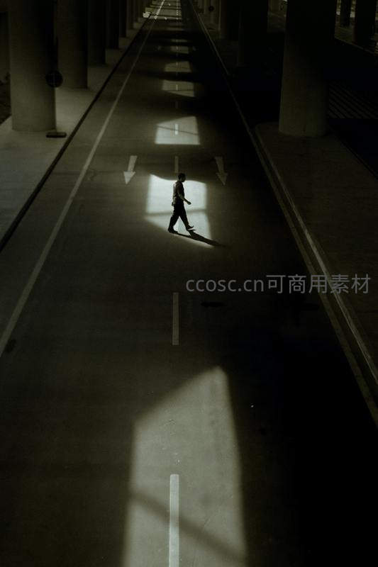 在高架桥下,一道道光束穿透柱廊洒在路面上,一个行人的剪影正沿着光斑前行,营造出强烈的纵深感与孤寂氛围。