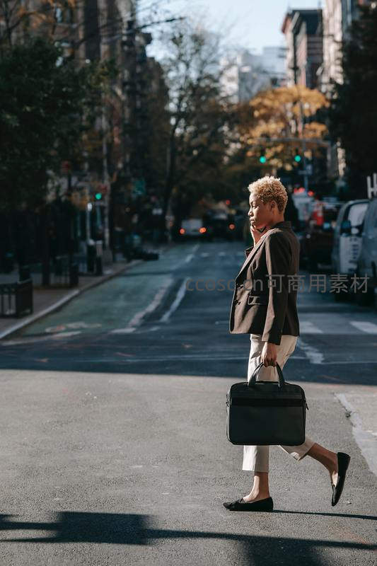 金发女子身着棕色西装,手提黑色公文包,在铺满落叶的秋日街道上优雅行走,阳光勾勒出她的轮廓,尽显都市独立女性魅力。