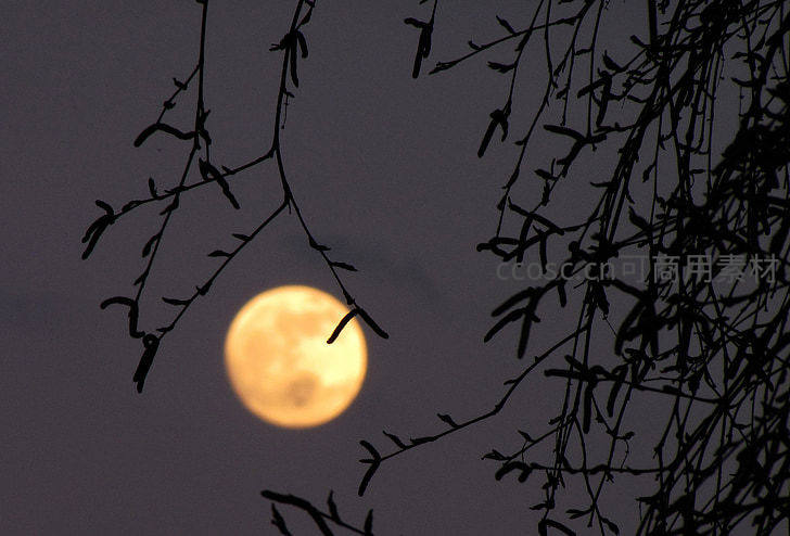 一轮金黄的满月透过垂柳的黑色枝条,形成诗意的剪影,夜幕低垂,氛围静谧而唯美。