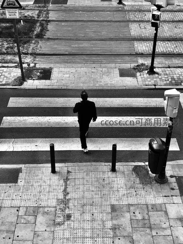 黑白街景中独行者穿越斑马线