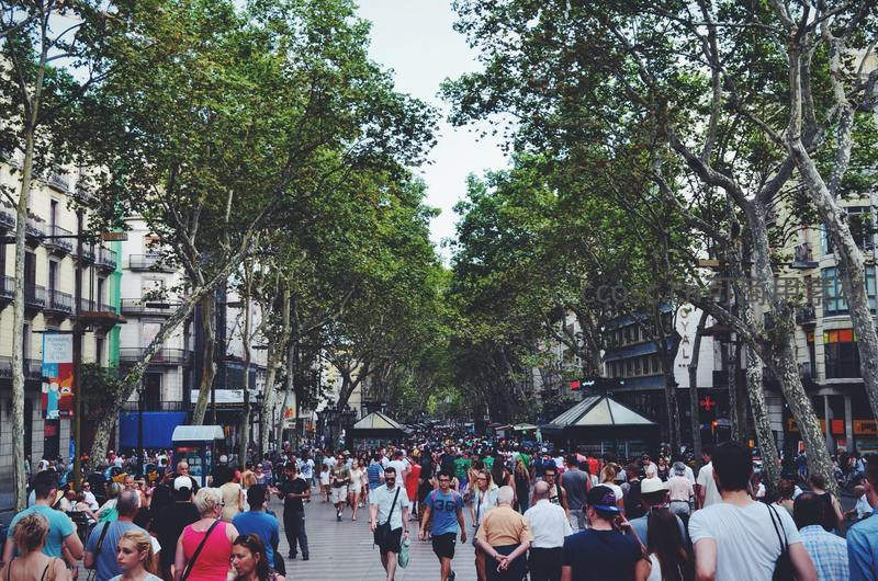 两旁高大浓密的梧桐树形成天然绿廊,阳光透过叶隙洒在热闹的步行街上,游客与市民悠闲穿行,享受惬意的城市慢生活。