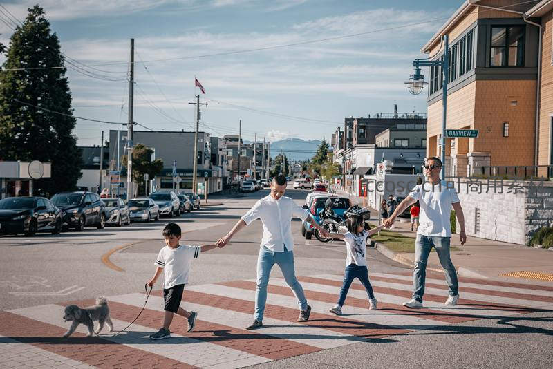 一个幸福的家庭在晴朗的午后手牵手穿过斑马线,孩子们欢笑着,小狗也活泼地跟在一旁,背景是宁静的街区和远处的青山,洋溢着生活的美好。