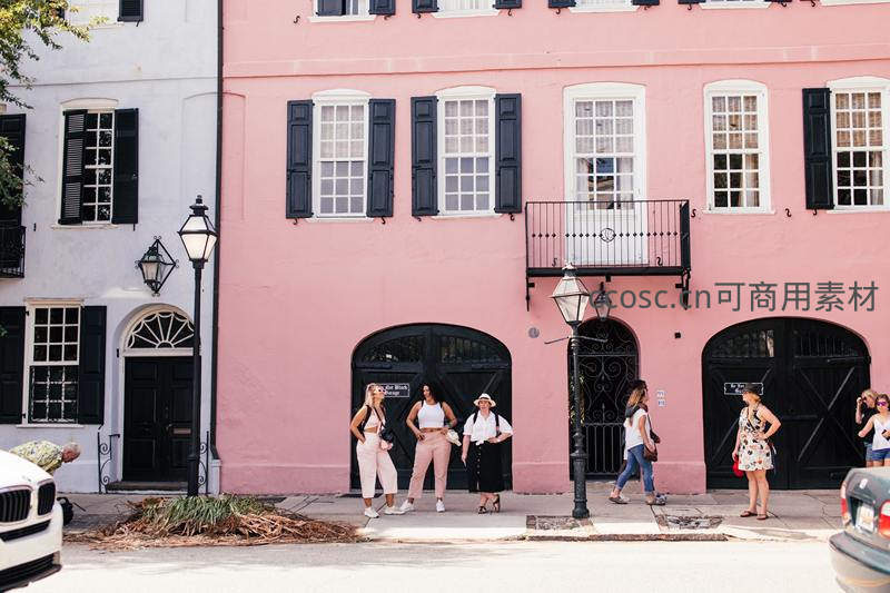 几位年轻女性在色彩鲜明的粉墙黑窗建筑前驻足拍照,古典建筑与现代穿搭形成视觉对比,充满活力与艺术感的城市街景。