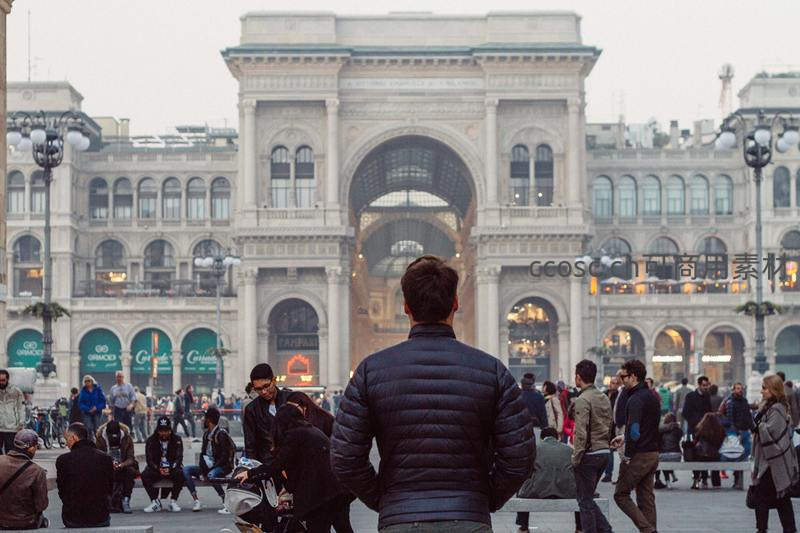 在开阔的城市广场上,游客们聚集在一座古典风格的大型拱门建筑前,背景是繁华的商业街区,充满活力与历史感。